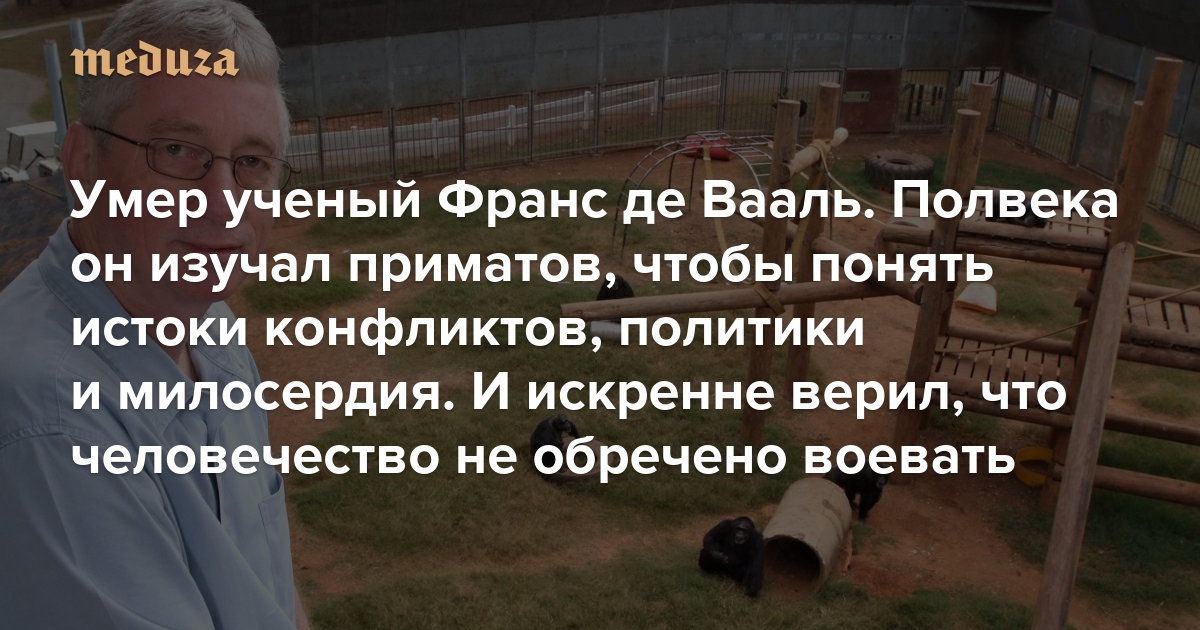 «Франс де Вааль — один из ключевых представителей поколения натуралистов: ученых, которые во второй половине ХХ века сделали очень неожиданную вещь в науке об эволюции приматов и человека, — рассказывает „Медузе“ научный обозреватель и ведущий подкаста „Голый землекоп“ Илья Колмановский. — Они остановили попытки подвергать животных искусственным экспериментам — и стали просто наблюдать их естественное поведение. Так они узнали, что на самом деле было главным поводом для сапиенсов стать такими умными — и такими беспощадными».