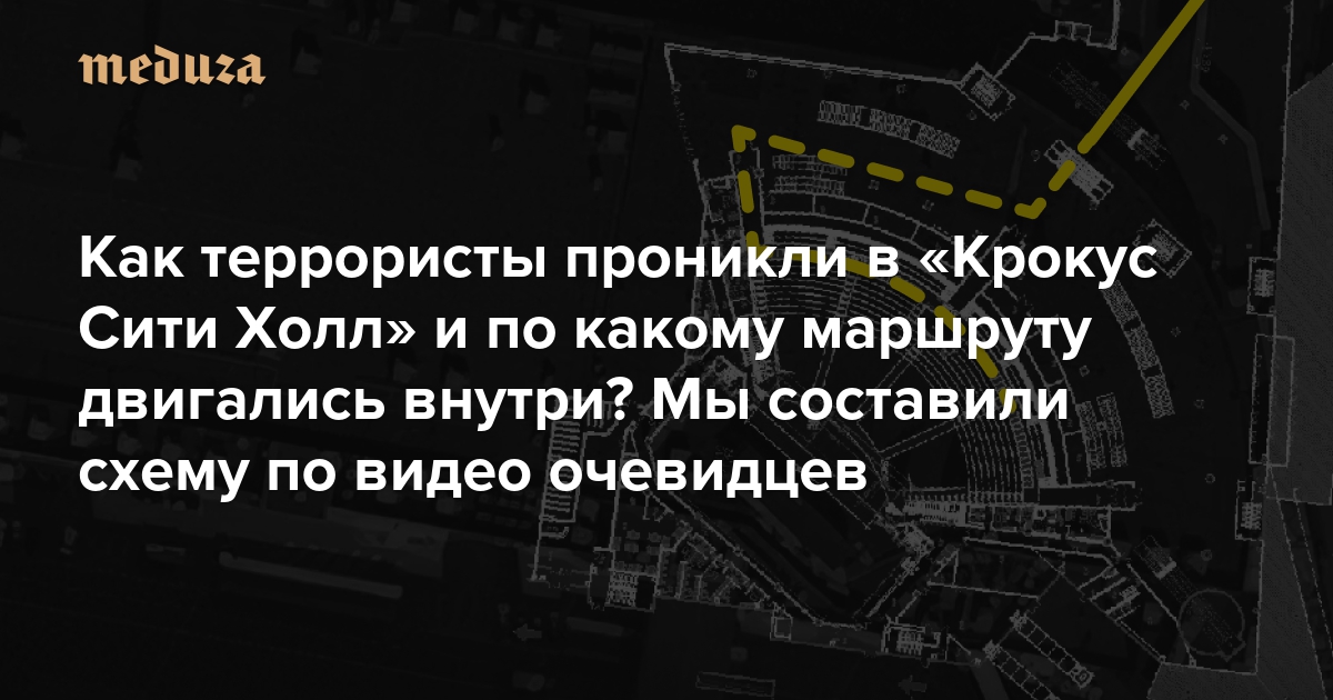 На основании опубликованных видеоматериалов «Медуза» восстановила маршрут движения террористов в «Крокус Сити Холле». Из того, что известно по состоянию на вечер 23 марта, картина выглядит следующим образом.