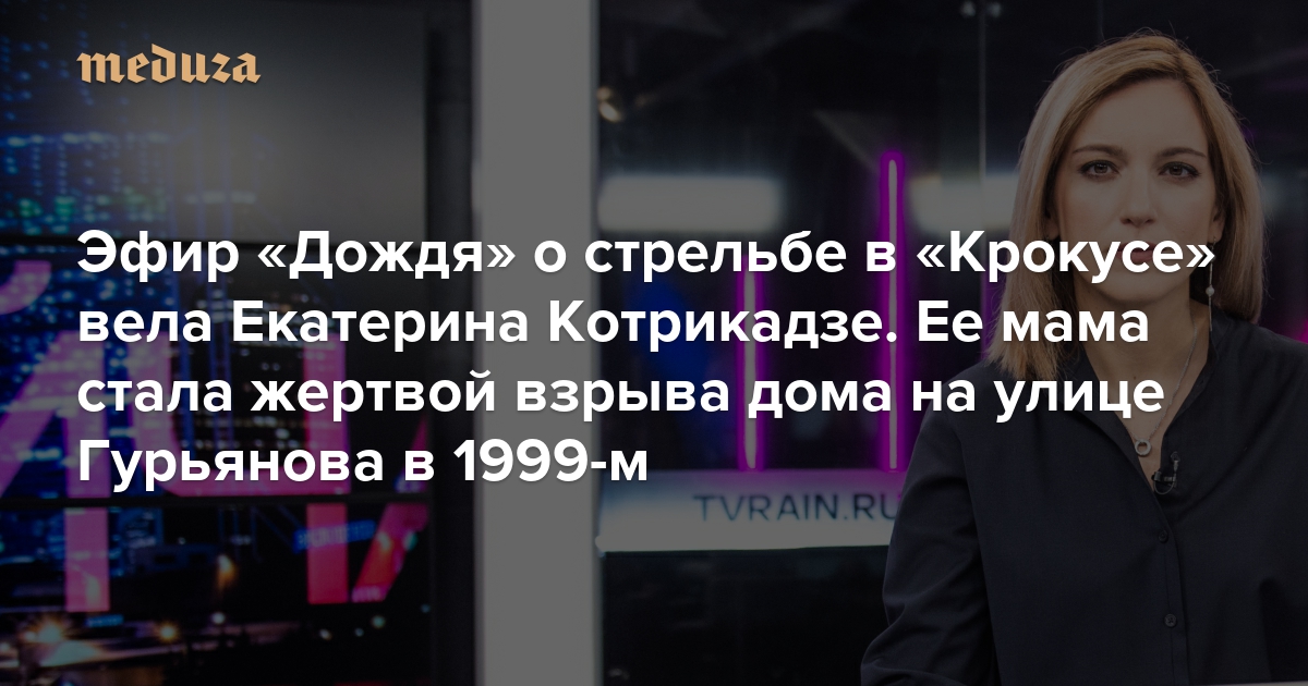 Вечером 22 марта специальный эфир телеканала «Дождь» о теракте в «Крокусе» вела Екатерина Котрикадзе. Мама журналистки Лия Бахтадзе погибла почти 25 лет назад в другом теракте — при взрыве дома на улице Гурьянова в сентябре 1999-го. Тогда жертвами атаки стали 106 человек, еще почти 700 пострадали. Спецкор «Медузы» Светлана Рейтер поговорила с Екатериной Котрикадзе.