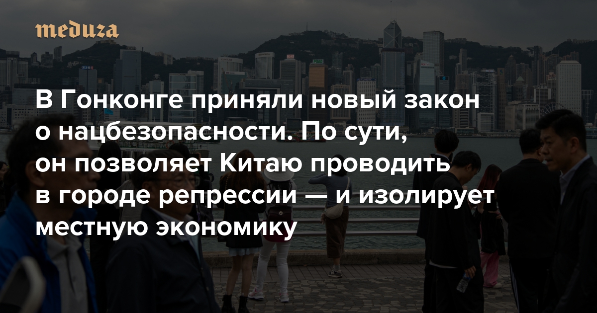 В Гонконге вступил в силу новый закон о безопасности, который заметно расширяет права местной администрации, ужесточает наказание за некоторые преступления и ограничивает свободы граждан. Власти утверждают, что изменения не репрессивные и что большинство из них повторяют аналогичные правовые нормы в западных странах. Однако многие местные жители и эксперты опасаются, что от нового закона серьезно пострадают экономика и гражданское общество, а руководство Гонконга внедрит тотальный контроль над населением, как в континентальном Китае. «Медуза» рассказывает, как Пекин пытается подчинить себе специальный административный район и чем именно грозит Гонконгу потеря автономии.
