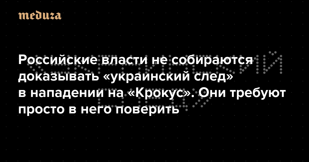 Российские власти не собираются доказывать «украинский след» в нападении на «Крокус». Они требуют просто в него поверить Выпуск рассылки «Сигнал» на «Медузе»