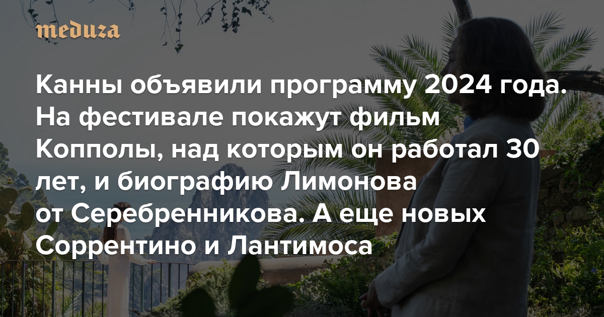 Канны объявили программу 2024 года. На фестивале покажут фильм Копполы, над которым он работал 30 лет, и биографию Лимонова от Серебренникова А еще новых Соррентино и Лантимоса
