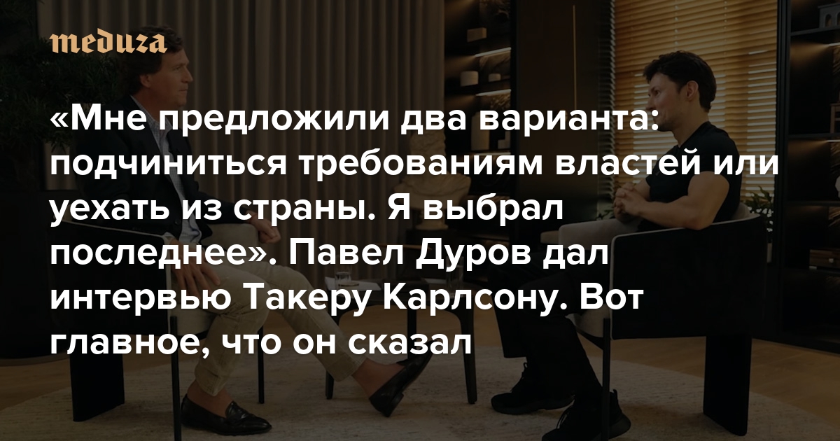 «Мне предложили два варианта: подчиниться требованиям властей или уехать из страны. Я выбрал последнее» Павел Дуров дал интервью Такеру Карлсону. Вот главное, что он сказал