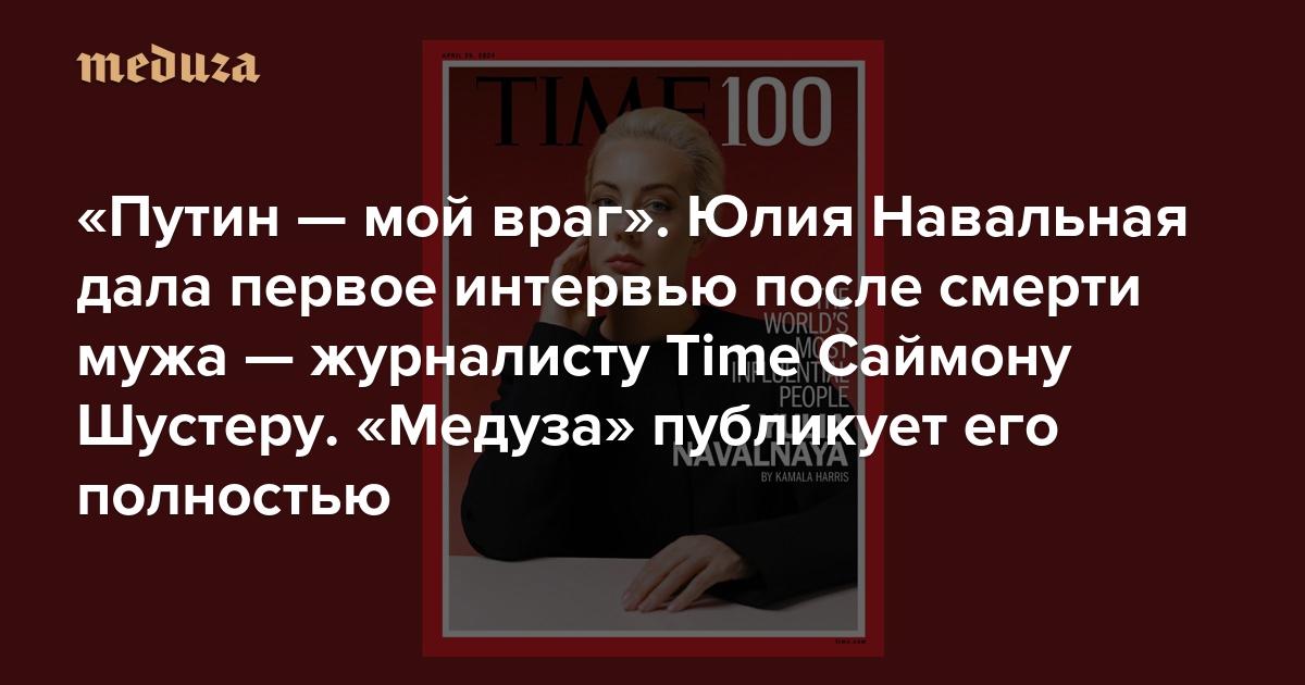 Американский журнал Time включил Юлию Навальную, вдову Алексея Навального, в список самых влиятельных людей мира. Навальная дала большое интервью изданию, поговорив с журналистом Саймоном Шустером. В нем она рассказала, когда последний раз виделась с Алексеем и почему решила продолжить дело мужа, — а также объяснила, как надо относиться к Владимиру Путину. С любезного разрешения редакции Time «Медуза» публикует интервью целиком.