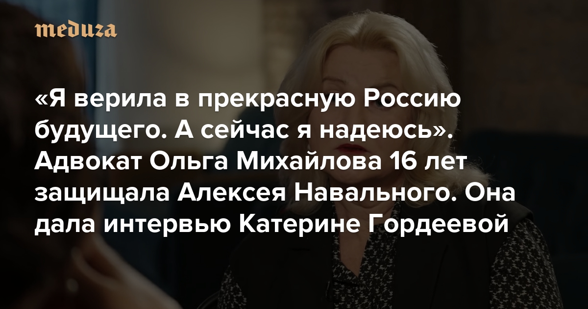 Адвокат Ольга Михайлова защищала Алексея Навального в течение 16 лет. Она была его адвокатом в делах «Кировлеса» и «Ив Роше», выиграла вместе с ним дело в Большой палате Европейского суда, которая признала преследование Навального политическим, и навещала политика в колонии, когда он вернулся в Россию — потом его посадили на девять лет, а затем еще на 19. В октябре 2023 года Михайлова улетела на несколько дней в отпуск. В это время троих ее коллег, также защищавших Навального, арестовали по обвинению в «экстремизме». В Россию Михайлова не вернулась. В феврале 2024 года суд заочно арестовал ее по обвинению в участии в «экстремистском сообществе». В интервью журналистке Катерине Гордеевой Михайлова рассказала о своем отъезде из России, делах против Алексея Навального и вере в прекрасную Россию будущего.