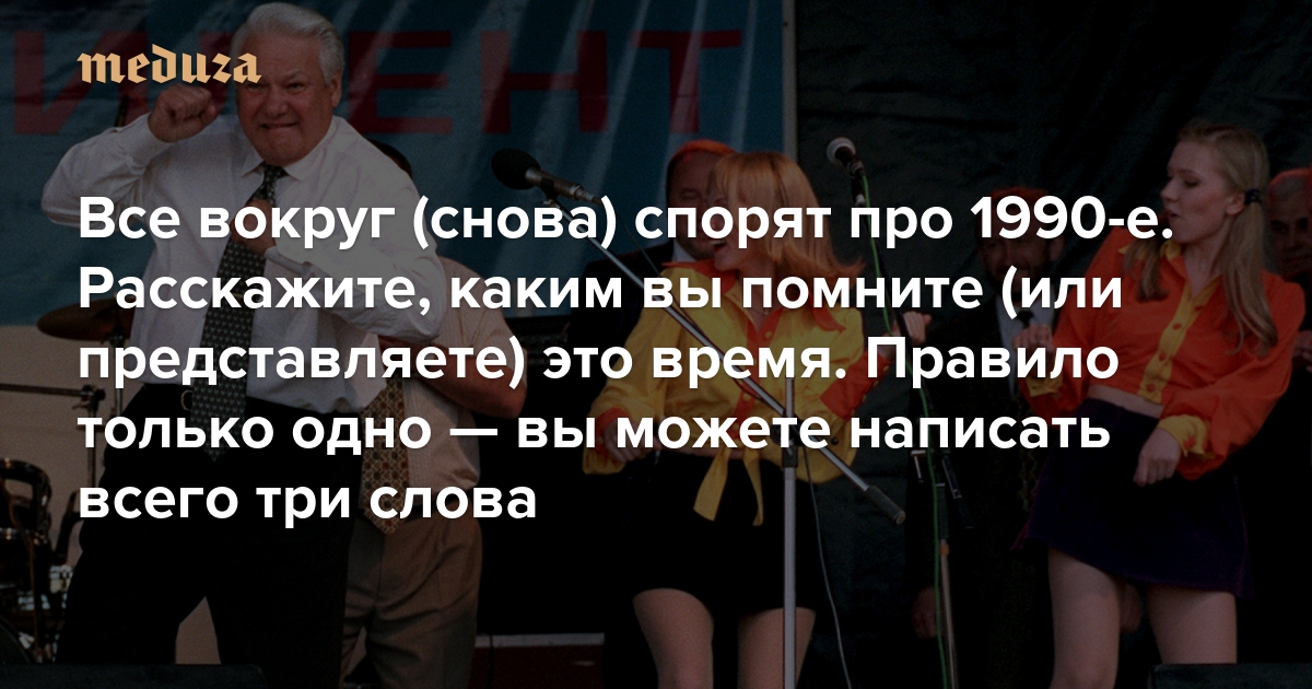 В апреле команда Алексея Навального запустила новый документальный проект — сериал «Предатели». В нем Мария Певчих рассказывает о людях, которые, по мнению ФБК, заложили фундамент путинского режима, — например, о первом президенте РФ Борисе Ельцине и его окружении, олигархах Борисе Березовском и Романе Абрамовиче, а также других ключевых персонажах 1990-х. Сериал спровоцировал множество споров в соцсетях — особенно активно его критикуют свидетели и участники событий тех лет, а также исследователи этого периода. Многие из нас тоже хорошо помнят, что происходило в то десятилетие. А если не помнят, то ярко представляют себе это время, потому что в России оно давно превратилось в миф. Расскажите «Медузе», какими вы запомнили 1990-е — или как вы их себе представляете, если вы тогда были ребенком (а может быть, вообще еще не родились, но много слышали от родственников про жизнь в те годы). Важно — напишите только три слова, которые, как кажется лично вам, наиболее точно описывают российские 1990-е.