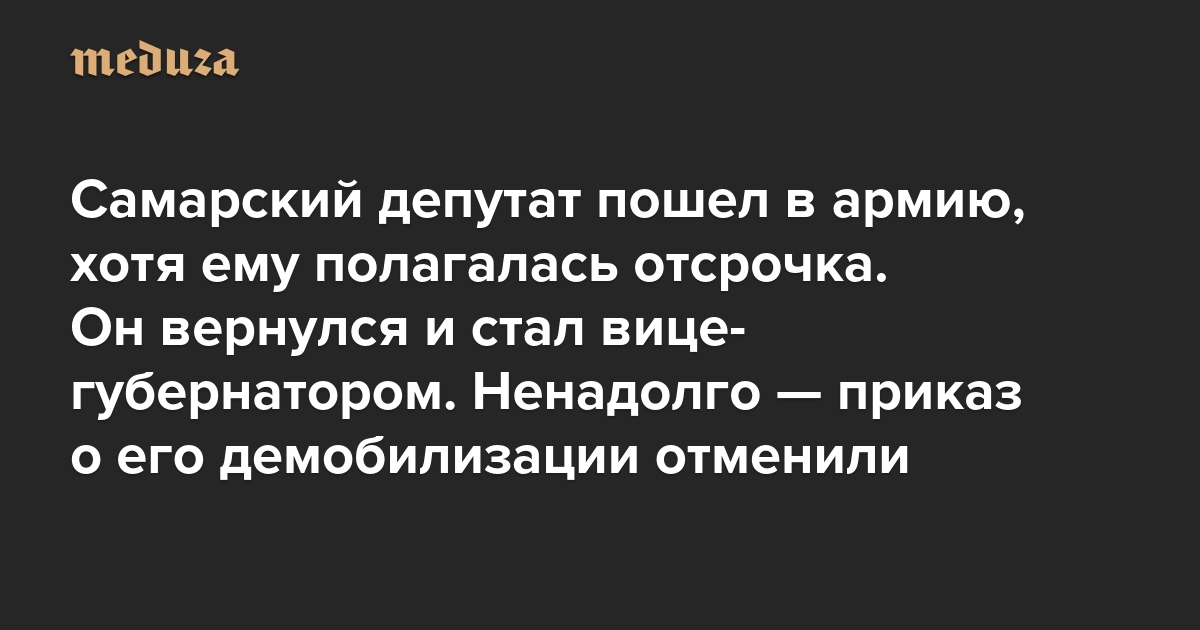 Самарский депутат пошел в армию, хотя ему полагалась отсрочка. Он вернулся и стал вице-губернатором. Ненадолго — приказ о его демобилизации отменили