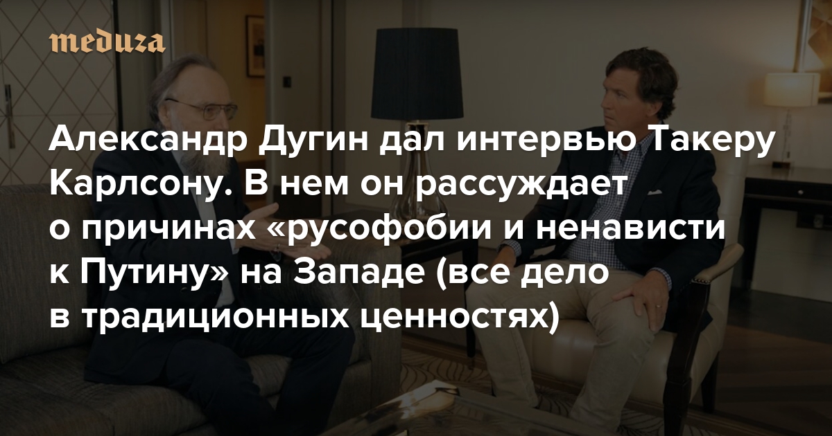Александр Дугин дал интервью Такеру Карлсону В нем он рассуждает о причинах «русофобии и ненависти к Путину» на Западе (все дело в традиционных ценностях), а также о проблемах либерализма и индивидуализма