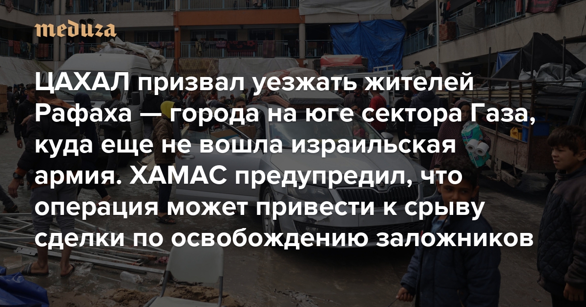ЦАХАЛ призвал уезжать жителей Рафаха — города на юге сектора Газа, куда еще не вошла израильская армия ХАМАС предупредил, что наземная операция может привести к срыву сделки по освобождению заложников