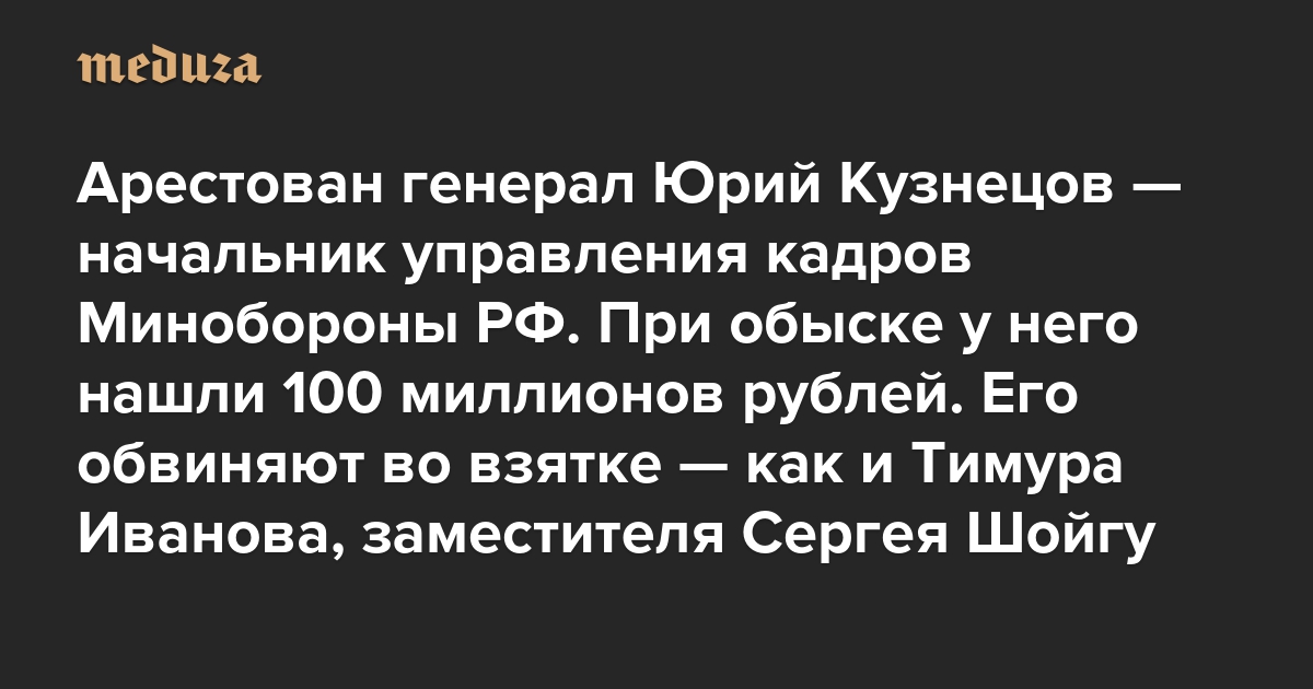 Арестован генерал Юрий Кузнецов — начальник управления кадров Минобороны России. При обыске у него нашли 100 миллионов рублей Его обвиняют во взятке — как и Тимура Иванова, заместителя Сергея Шойгу