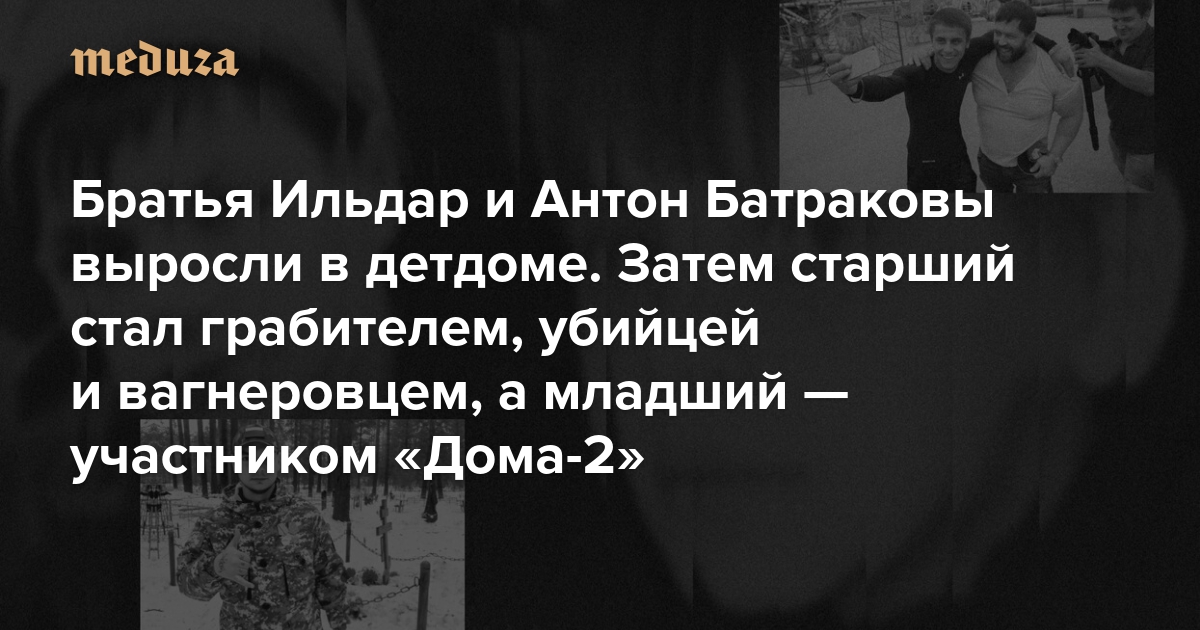 Ильдар и Антон Батраковы — сводные братья, которые выросли в детском доме в Чувашии. Когда они повзрослели, их судьба сложилась очень по-разному. Ильдар стал грабителем и убийцей: его приговорили к 24 годам колонии, откуда он уехал на фронт в Украину в составе ЧВК «Вагнер». Он был тяжело ранен, вернулся, но не смог адаптироваться к мирной жизни и решил снова отправиться на войну. Антона усыновила американская семья, но жизнь в США не сложилась, он переехал в Россию и стал участником «Дома-2». Издание «Люди Байкала» рассказывает историю братьев Батраковых. «Медуза» публикует этот текст целиком.