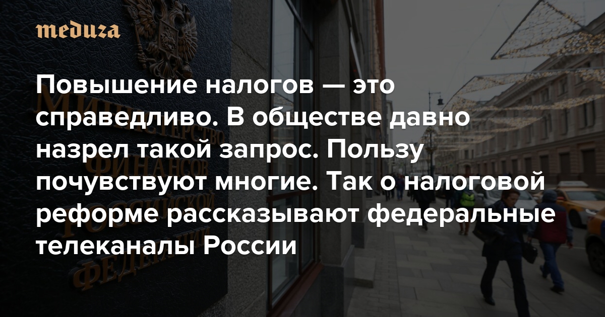 Повышение налогов — это справедливо. В обществе давно назрел такой запрос. Пользу почувствуют многие В России — «изменение», «совершенствование» и «донастройка» налоговой системы. Так об этом рассказывают федеральные телеканалы