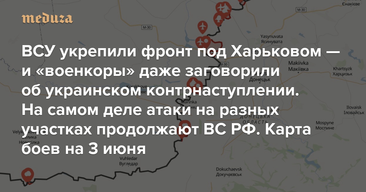 ВСУ укрепили фронт под Харьковом сильными резервами — и «военкоры» даже заговорили об украинском контрнаступлении. На самом деле атаки на разных участках продолжают ВС РФ Где ВСУ приходится особенно сложно? Карта боев на 3 июня