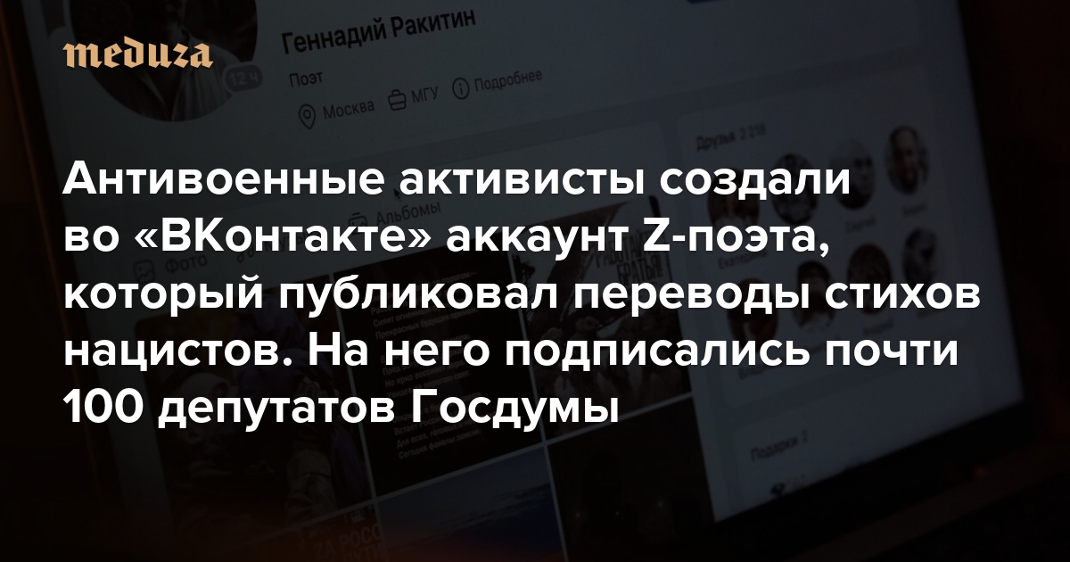 Сегодня журналист Андрей Захаров рассказал, что аккаунт Геннадия Ракитина был создан его знакомыми — антивоенными активистами, которые публиковали переводы стихов поэтов нацистской Германии 1930–1940-х годов.