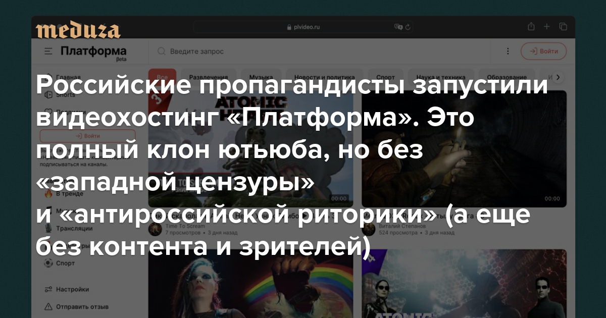 Российские пропагандисты запустили видеохостинг «Платформа». Это полный клон ютьюба, но без «западной цензуры» и «антироссийской риторики» (а еще без контента и зрителей)