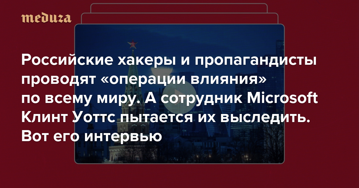 Клинт Уоттс — генеральный директор Центра анализа цифровых угроз Microsoft. Он возглавляет команду из 30 человек, которая отслеживает «операции влияния» России, Ирана и Китая по всему миру. Команда Уоттса использует информацию из открытых источников на 15 языках, чтобы находить и изучать пропагандистские объединения. По просьбе «Медузы» американская журналистка Таня Лукьянова поговорила с Уоттсом о российских методах дезинформации в интернете и попытках троллей наладить отношения с западными консерваторами.