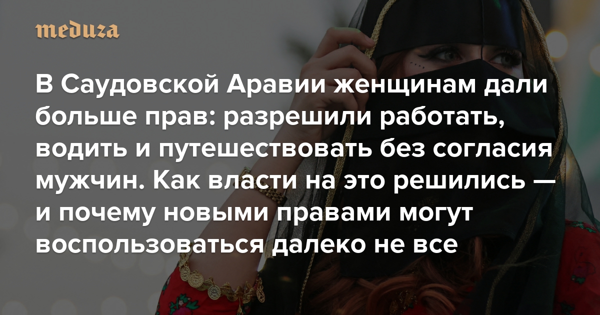 В Саудовской Аравии женщинам дали больше прав: разрешили работать, водить и путешествовать без согласия мужчин «Медуза» рассказывает, как власти на это решились — и почему новыми правами могут воспользоваться далеко не все