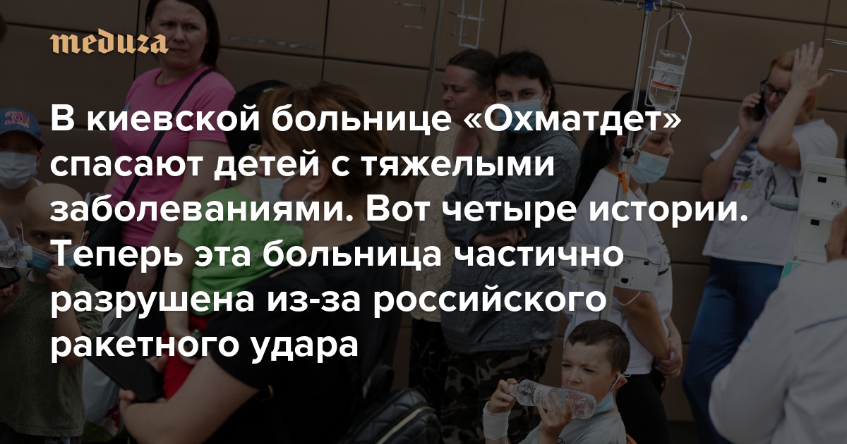 При обстреле Киева 8 июля российская ракета попала в один из корпусов «Охматдета» — самой большой многопрофильной детской больницы Украины и одного из старейших госпиталей страны. Ежегодно в этой больнице проходят лечение до 18 тысяч детей, в том числе с редкими и тяжелыми заболеваниями. Там проводят консультации более чем 279 тысячам пациентов, там проходят более 10 тысяч операций в год. После начала полномасштабного российского вторжения в Украину «Охматдет» продолжает принимать детей, в том числе пострадавших при обстрелах. Владимир Зеленский назвал «Охматдет» одной из самых важных детских больниц не только в Украине, но и в Европе. «Медуза» пересказывает четыре истории детей, которым оказали помощь в этой больнице. Эти истории были опубликованы в ее соцсетях в течение июня 2024 года.
