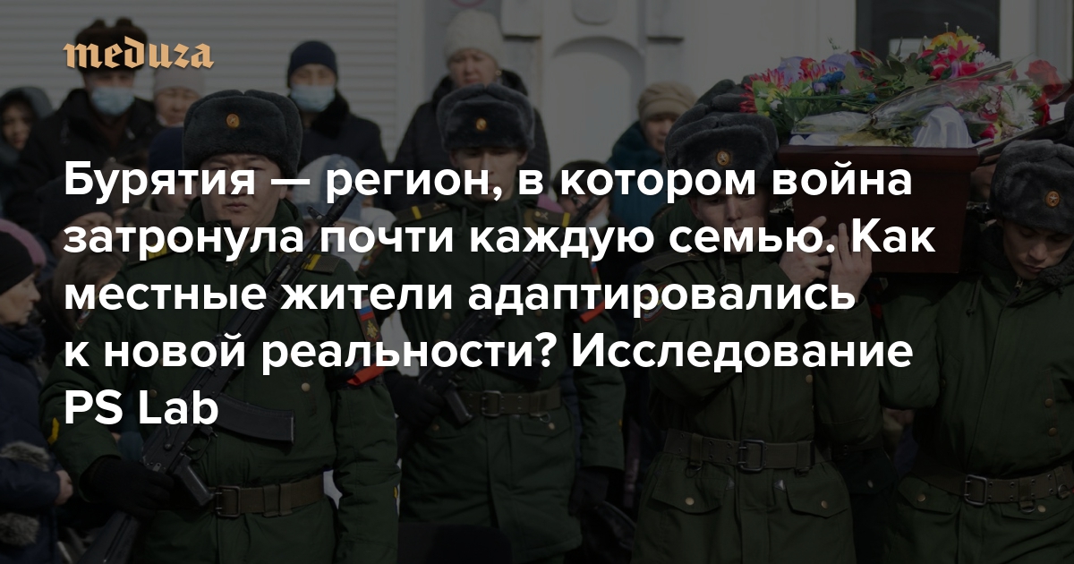 Лаборатория публичной социологии (PS Lab) обнародовала уникальное этнографическое исследование, посвященное отношению россиян к полномасштабной войне в Украине. Осенью 2023 года члены команды PS Lab совершили поездки в три региона — Свердловскую область, Бурятию и Краснодарский край — и провели там по месяцу. Им удалось собрать 75 глубинных интервью и составить три подробных этнографических дневника (около 110 тысяч слов или 250 страниц в каждом). «Медуза» уже публиковала отрывок из отчета PS Lab, адаптированный проектом Re:Russia. Теперь мы представляем еще одну главу из работы социологов — посвященную итогам этнографической командировки в Бурятию. Эта республика платит за войну в Украине одну из самых высоких цен — число жителей региона, служащих в ВС РФ, непропорционально высоко, равно как и их доля в потерях российской армии. О том, как эти факты воспринимают внутри Бурятии, — в материале PS Lab.