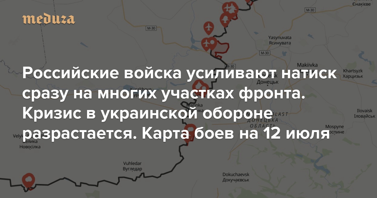 Российские войска усиливают натиск сразу на многих участках фронта. ВСУ перебрасывают резервы в самые горячие точки — но кризис в украинской обороне разрастается К чему может привести давление ВС РФ? Карта боев на 12 июля