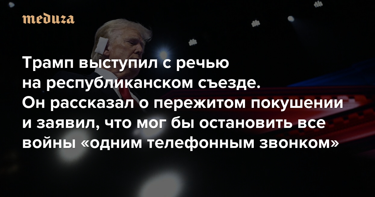 «Я стою перед вами на этой сцене только по милости Бога» Трамп выступил с речью на республиканском съезде. Он рассказал о пережитом покушении и заявил, что мог бы остановить все войны «одним телефонным звонком»