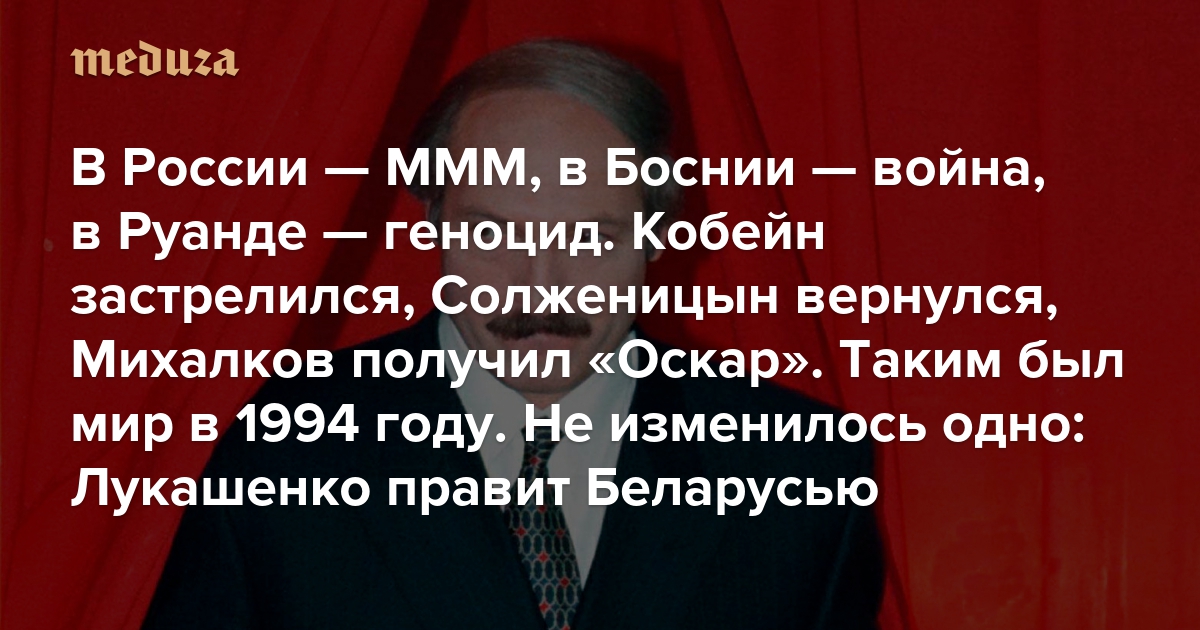 В России — МММ, в Боснии — война, в Руанде — геноцид. Кобейн застрелился, Солженицын вернулся на родину, Михалков получил «Оскар» Таким был мир в 1994 году. С тех пор не изменилось одно: Лукашенко правит Беларусью