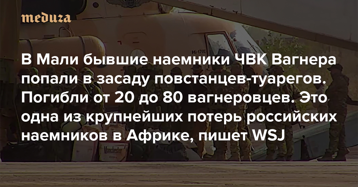 В Мали бывшие наемники ЧВК Вагнера попали в засаду повстанцев-туарегов Погибли от 20 до 80 вагнеровцев. Это одна из крупнейших потерь российских наемников в Африке, пишет WSJ
