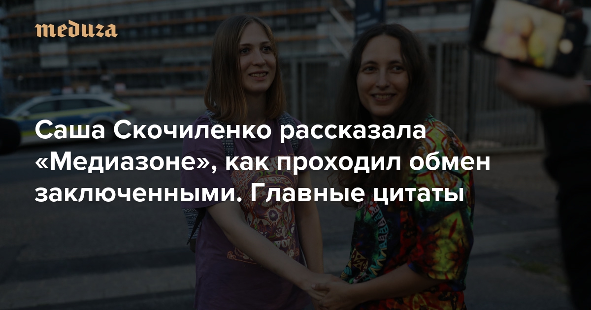 «Медиазона» выпустила 2 августа рассказ художницы Саши Скочиленко, который записал журналист Давид Френкель. В нем бывшая политзаключенная, участвовавшая в масштабном обмене заключенными между Россией и странами Запада, рассказала, как ее везли для обмена из Петербурга в Москву, затем в Анкару, а оттуда — в Кельн, как вели себя представители силовых структур и как она чувствует себя после освобождения. «Медуза» приводит фрагменты ее монолога.