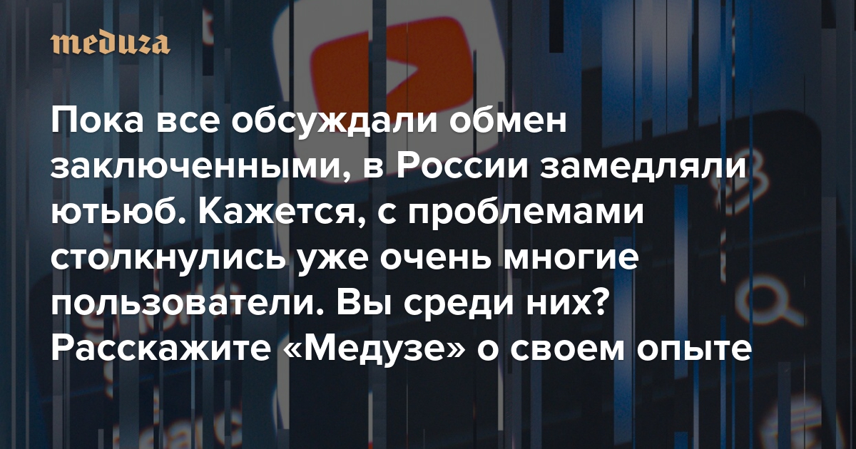Пока все обсуждали обмен заключенными, в России замедляли ютьюб. Кажется, с проблемами столкнулись уже очень многие пользователи Вы среди них? Расскажите «Медузе» о своем опыте