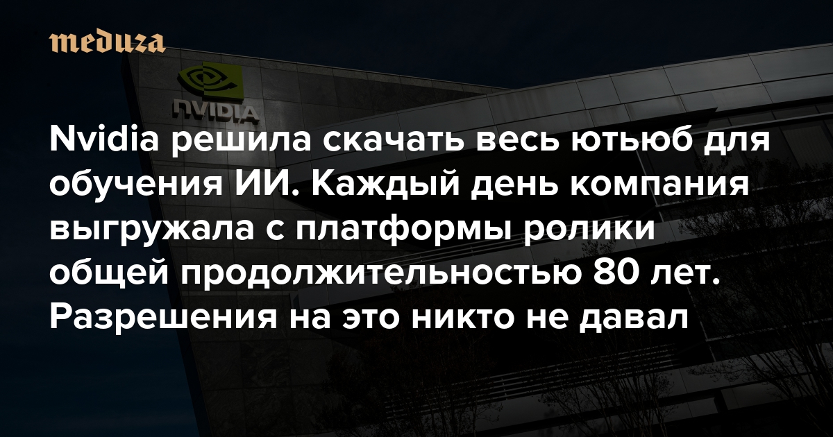 Компания Nvidia — ведущий мировой производитель графических процессоров (GPU) и систем на чипе (SoC) — нелегально использовала видео с YouTube, Netflix и других платформ для обучения своего искусственного интеллекта. Это подтверждают внутренние документы, к которым получили доступ журналисты. Ежедневно сотрудники Nvidia скачивали контент, общая продолжительность которого составляла около 80 лет. Представители компании утверждают, что их действия «полностью соответствуют букве и духу закона об авторском праве». «Медуза» пересказывает главное из расследования 404 Media.