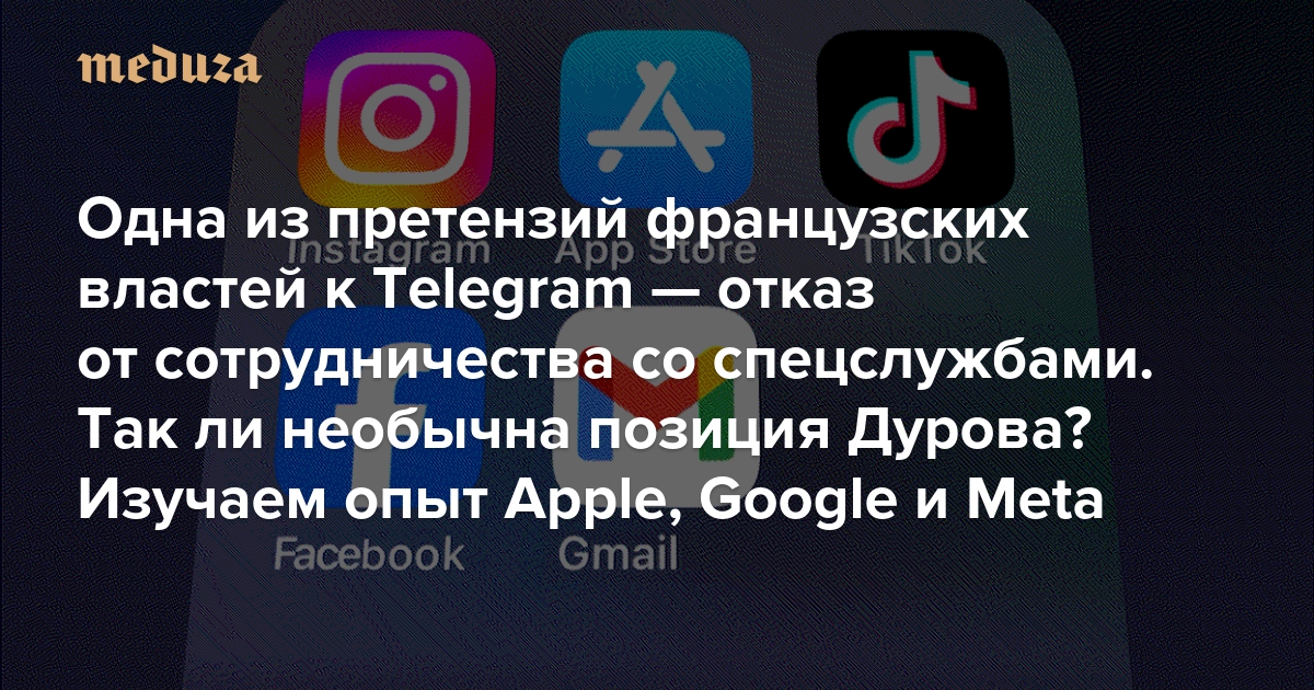 Одна из претензий французских властей к Telegram — отказ от сотрудничества со спецслужбами Так ли необычна позиция Дурова? Изучаем опыт Apple, Google и Meta