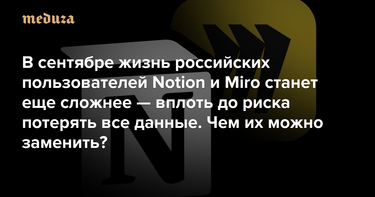 В сентябре приложения для совместной работы Miro и Notion перестанут предоставлять доступ к своим платформам для пользователей из России. Они объясняют свое решение американскими санкциями против IT-сектора. Причем если Miro продолжит поддержку бесплатных аккаунтов, то Notion полностью удалит всю информацию пользователей, если они хоть раз платили за подписку российской картой. «Медуза» рассказывает, что это за сервисы и чем их можно заменить.