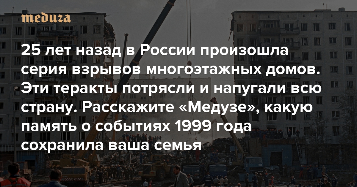 25 лет назад в России произошла серия взрывов многоэтажных домов. Эти теракты потрясли и напугали всю страну Расскажите «Медузе», какую память о событиях 1999 года сохранила ваша семья
