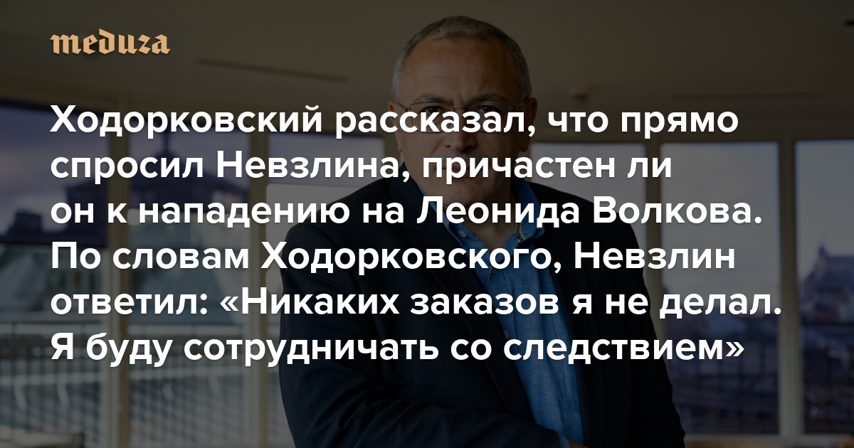 Ходорковский рассказал, что прямо спросил Невзлина, причастен ли он к нападению на Леонида Волкова По словам Ходорковского, Невзлин ответил: «Никаких заказов я не делал. Я буду сотрудничать со следствием»