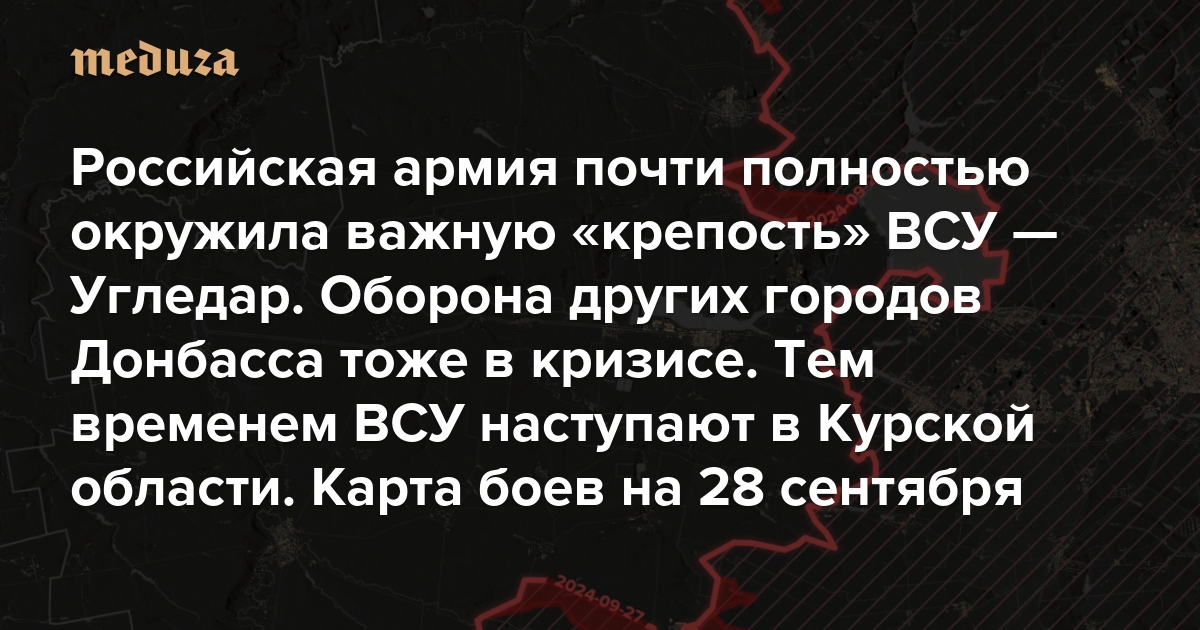 Российская армия почти полностью окружила важную «крепость» ВСУ — Угледар. Оборона других городов Донбасса тоже в кризисе Тем временем ВСУ наступают в Курской области. Карта боев на 28 сентября