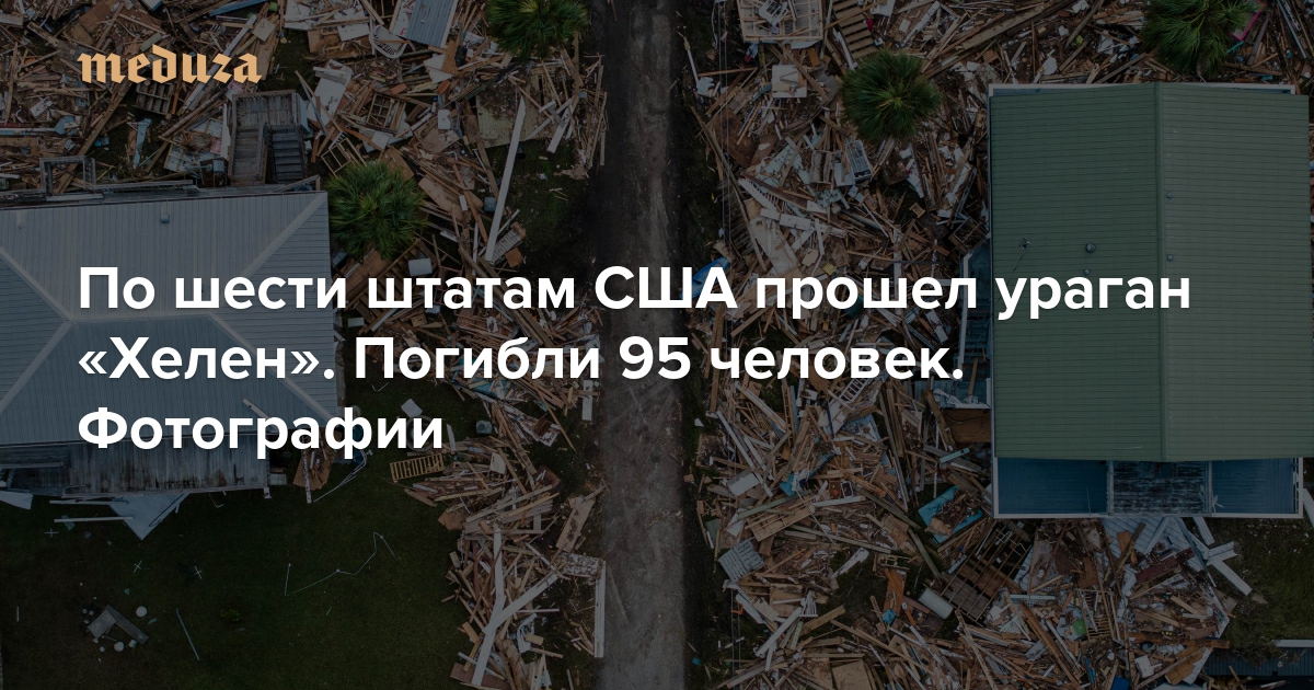 Ураган «Хелен» прошел по США. В шести штатах — Северной Каролине, Южной Каролине, Джорджии, Флориде, Теннесси и Вирджинии, — по последним данным, погибли 95 человек. Не менее двух миллионов человек остались без электроэнергии, вышли из берегов реки, разрушены дороги и мосты, что затрудняет поставки товаров первой необходимости в пострадавшие от урагана районы. Власти опасаются, что погибших может оказаться больше: только в Северной Каролине, наиболее сильно пострадавшей от «Хелен», экстренные службы получили более 1000 обращений от людей, которые не могут связаться со своими родными и близкими. «Медуза» публикует фотографии последствий урагана «Хелен».