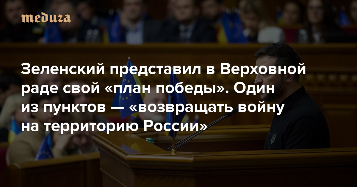 Президент Украины Владимир Зеленский 16 октября представил в Верховной раде свой «план победы» в российско-украинской войне. План состоит из пяти пунктов и трех тайных приложений. Предложенная стратегия, по словам Зеленского, призвана усилить Украину и ее позиции, чтобы после войны страна «была с мускулами». Воплотить этот план, считает президент Украины, можно с партнерами страны, и это «точно не зависит от России». По словам Зеленского, если начать выполнять пункты стратегии сейчас, то войну можно завершить не позднее 2025 года. Трансляция выступления Зеленского шла в ютьюб-канале офиса президента Украины, текст речи Зеленского опубликован на сайте его офиса. Рассказываем, из чего состоит «план победы» Украины.