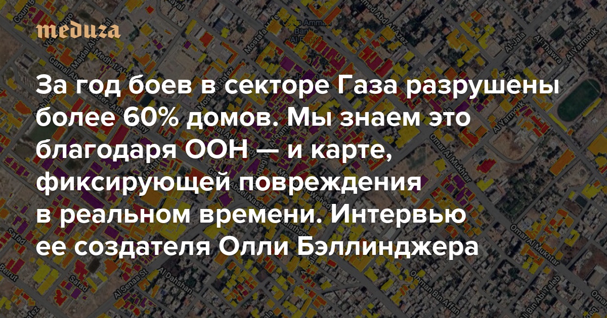 За год боев в секторе Газа разрушены более 60% домов. Мы знаем это благодаря ООН — и карте, фиксирующей повреждения в реальном времени Интервью ее создателя Олли Бэллинджера. Он придумал этот инструмент для оценки урона от войны в Украине