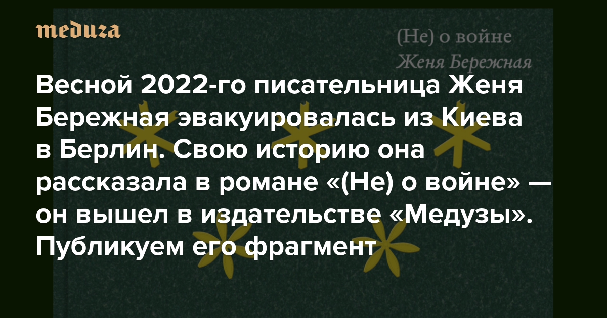 «Улыбайтесь, фройляйн, вас приветствует лучший город на земле!» Весной 2022-го писательница Женя Бережная эвакуировалась из Киева в Берлин. Свою историю она рассказала в романе «(Не) о войне» — он вышел в издательстве «Медузы». Публикуем его фрагмент