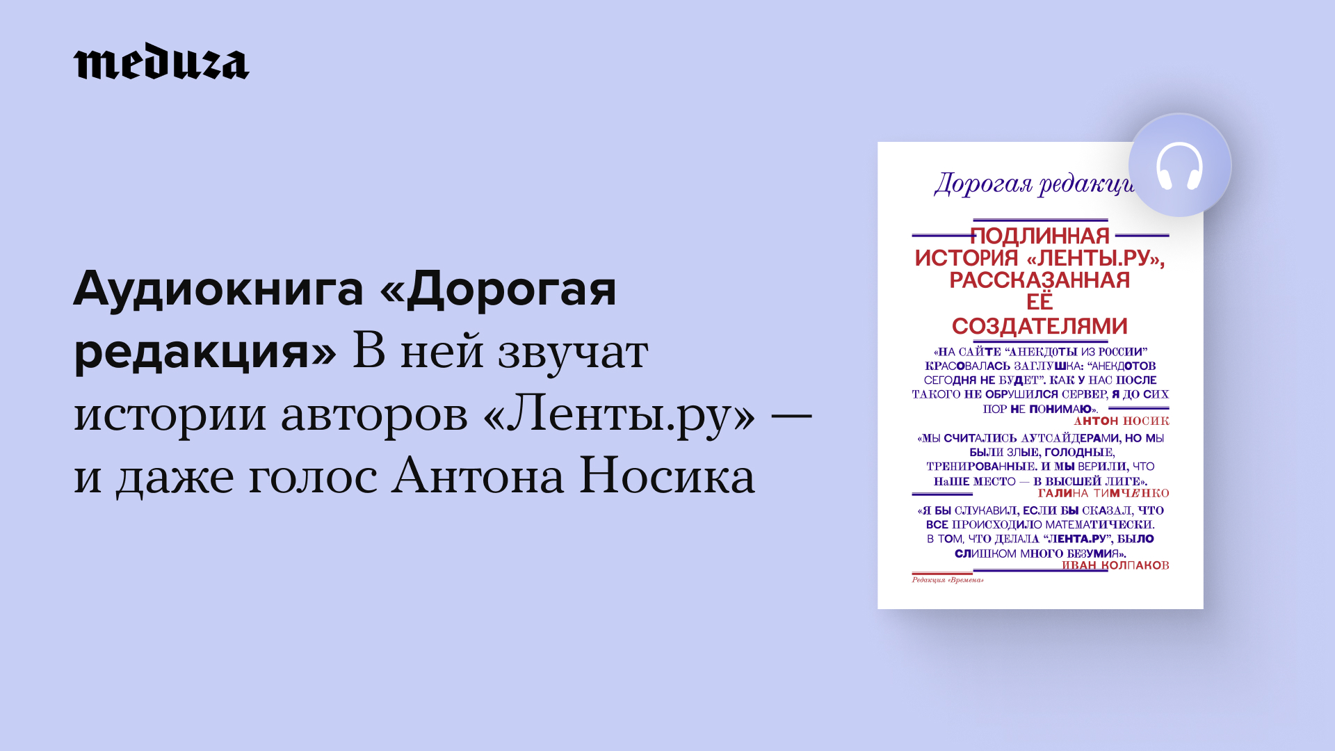 Подарки к 10-летию «Медузы» продолжаются! Один из них — книга «Дорогая редакция. Подлинная история „Ленты.ру“, рассказанная ее создателями». С прошлой недели ее можно бесплатно прочитать в нашем приложении. А теперь — еще и послушать! Да, мы выпускаем аудиоверсию «Дорогой редакции», в которой звучат голоса многих ее авторов. Послушайте ее здесь.