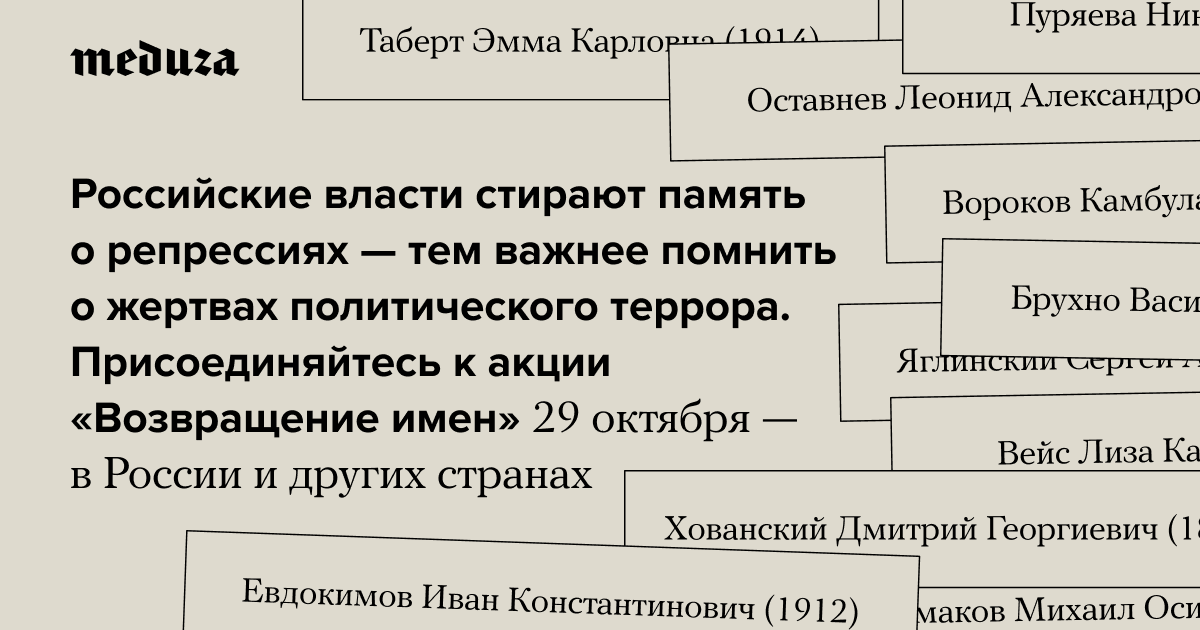 Российские власти стирают память о репрессиях — тем важнее помнить о жертвах политического террора. Присоединяйтесь к акции «Возвращение имен» 29 октября — в России и других странах