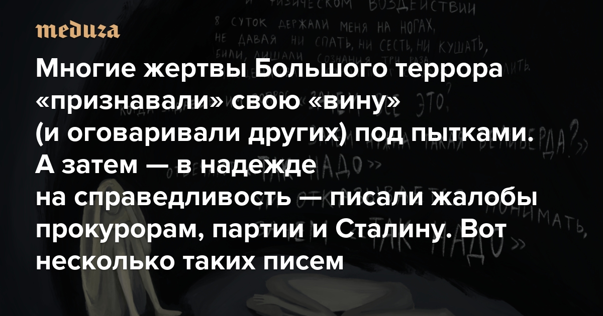 Крик в пустоту Многие жертвы Большого террора «признавали» свою «вину» (и оговаривали других) под пытками. А затем — в надежде на справедливость — писали жалобы прокурорам, партии и Сталину. Вот несколько таких писем