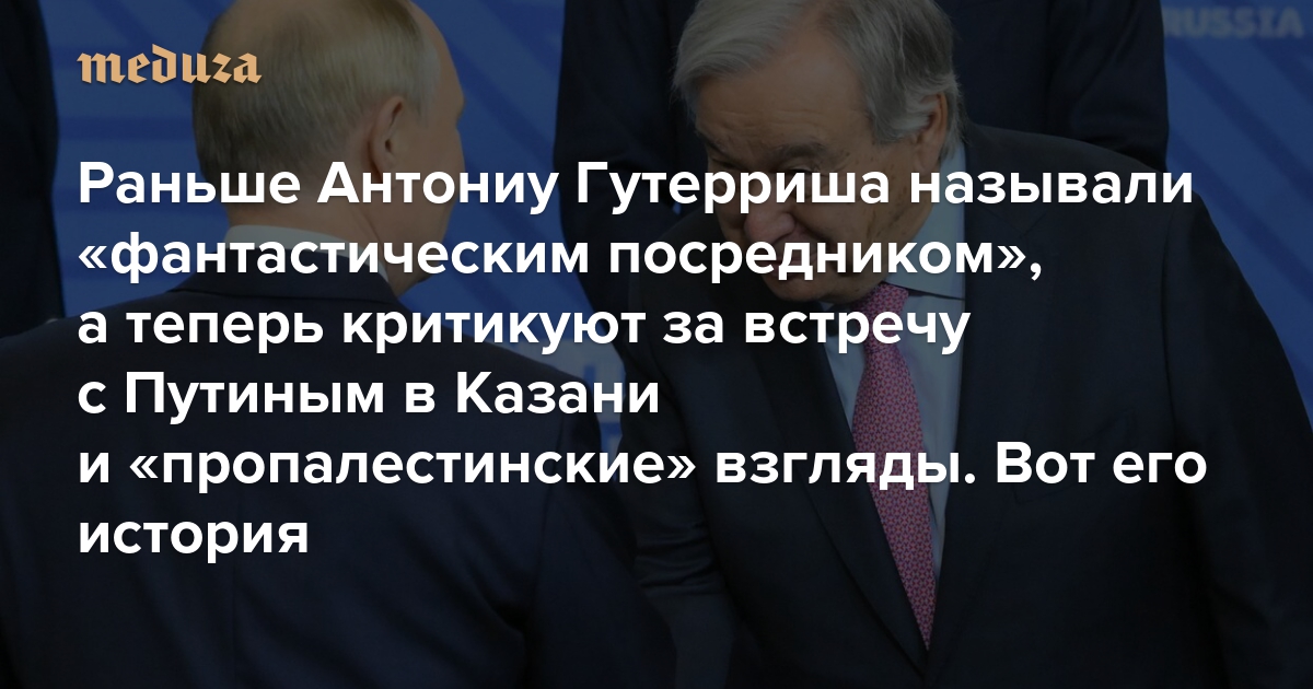 «Шел третий год войны. Генсек ООН жал руку убийце» Раньше Антониу Гутерриша называли «фантастическим посредником», а теперь критикуют за встречу с Путиным в Казани и «пропалестинские» взгляды. Вот его история