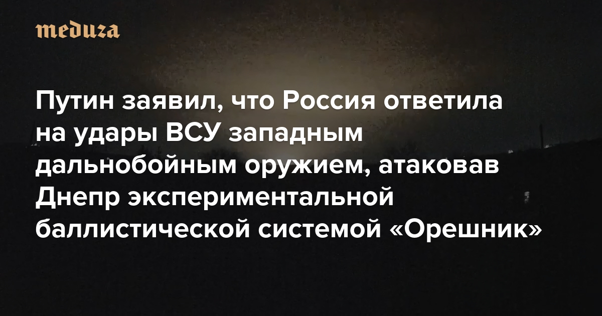 Путин заявил, что Россия ответила на удары ВСУ западным дальнобойным оружием, атаковав Днепр экспериментальной баллистической системой «Орешник». Он пригрозил ударами по военным объектам Запада