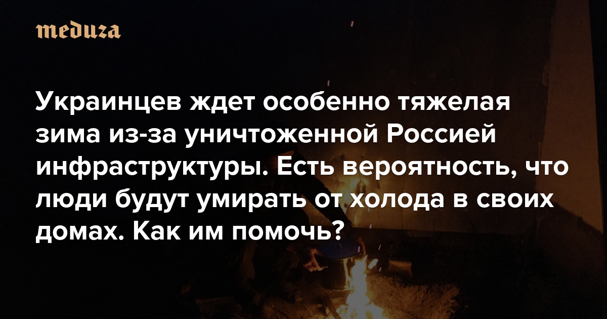К началу ноября украинская энергетическая система потеряла половину своих генерирующих мощностей из-за постоянных обстрелов со стороны России. По прогнозам экспертов, зимой в дома и на предприятия электричество не будет подаваться бо́льшую часть дня. Есть вероятность, что из-за этого люди будут просто умирать в своих домах. Кроме того, по этой же причине увеличится число беженцев. «Медуза» выбрала несколько проектов, в которых вы можете поучаствовать — и помочь людям, которые замерзают из-за войны.