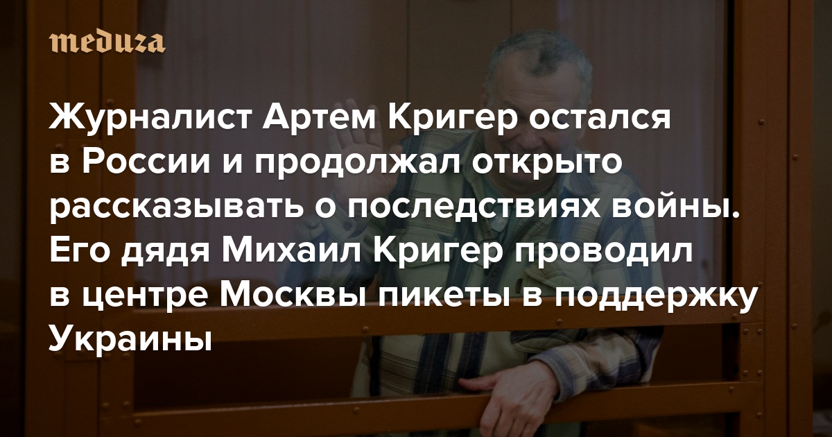 Активист Михаил Кригер участвовал в демократическом движении еще в 1990-х, тогда же начал помогать политзаключенным, а в 2020-х открыто осудил полномасштабное вторжение и поддержал Украину. Его племянник, Артем Кригер, работал журналистом издания Sota.vision и освещал суды и митинги в Москве. Спустя почти три года войны Михаил отбывает наказание за «оправдание терроризма» из-за постов в фейсбуке, а Артема судят за «участие в деятельности экстремистской организации» — ФБК. Издание «Берег» рассказывает историю семьи Кригеров, «Медуза» публикует этот текст целиком.