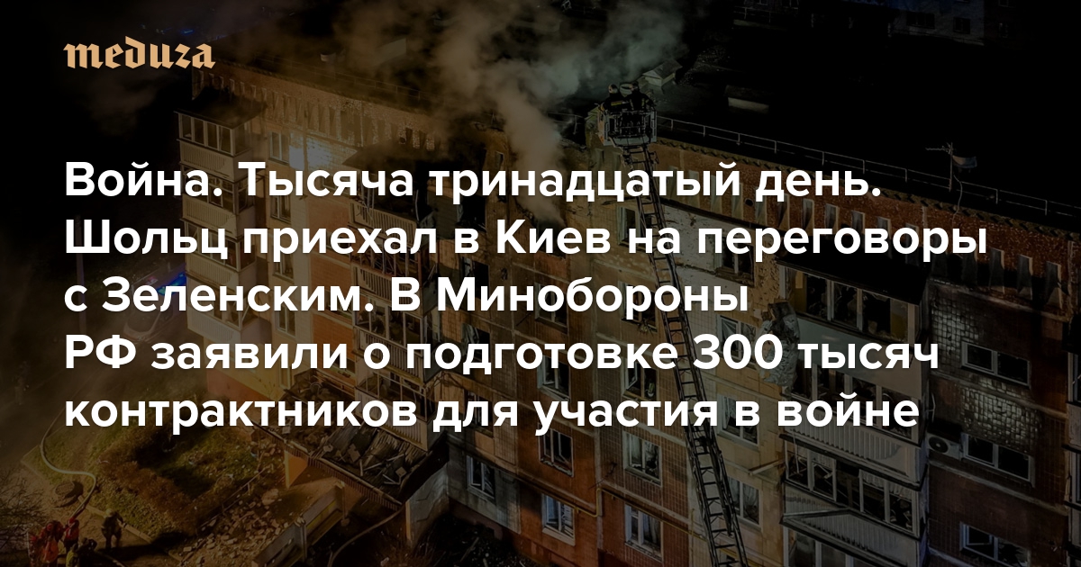 Война Тысяча тринадцатый день. Шольц приехал в Киев на переговоры с Зеленским — через две недели после звонка Путину. В Минобороны РФ заявили о подготовке 300 тысяч контрактников для участия в войне