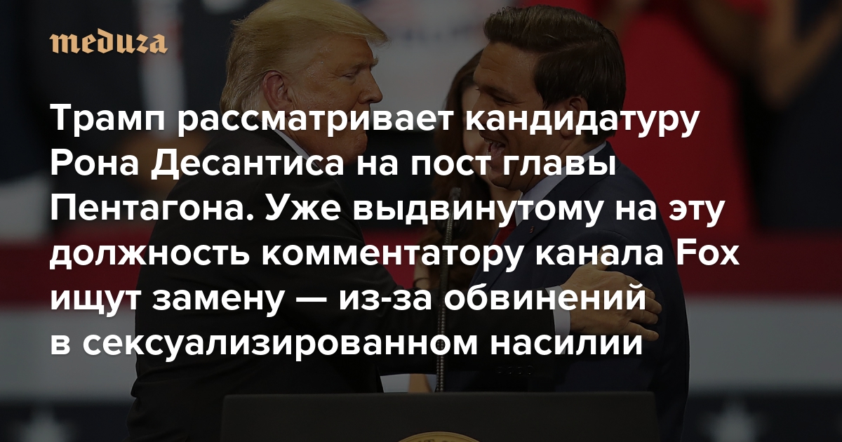 Трамп рассматривает кандидатуру своего бывшего соперника Рона Десантиса на пост главы Пентагона Уже выдвинутому на эту должность комментатору канала Fox ищут замену — из-за обвинений в сексуализированном насилии