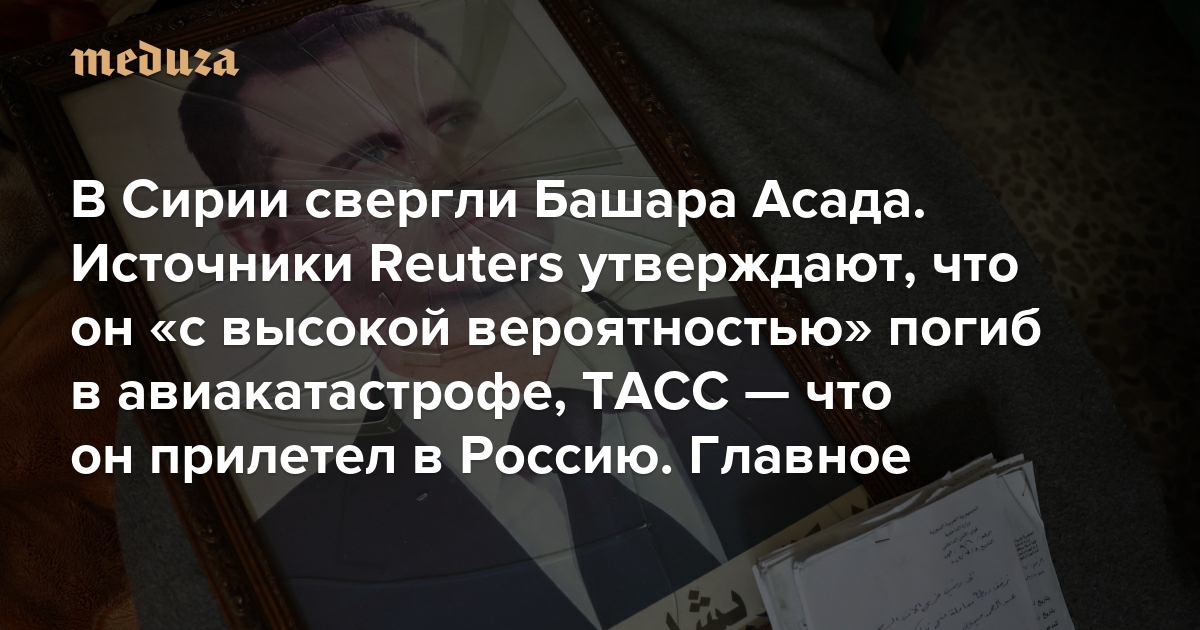В Сирии свергли Башара Асада. Источники Reuters утверждают, что он «с высокой вероятностью» погиб в авиакатастрофе, ТАСС — что он прилетел в Россию Главное
