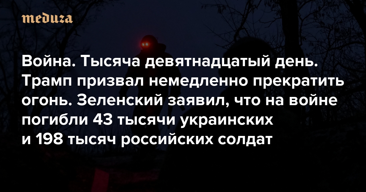 Война Тысяча девятнадцатый день. Трамп призвал немедленно прекратить огонь. Зеленский заявил, что на войне погибли 43 тысячи украинских и 198 тысяч российских солдат